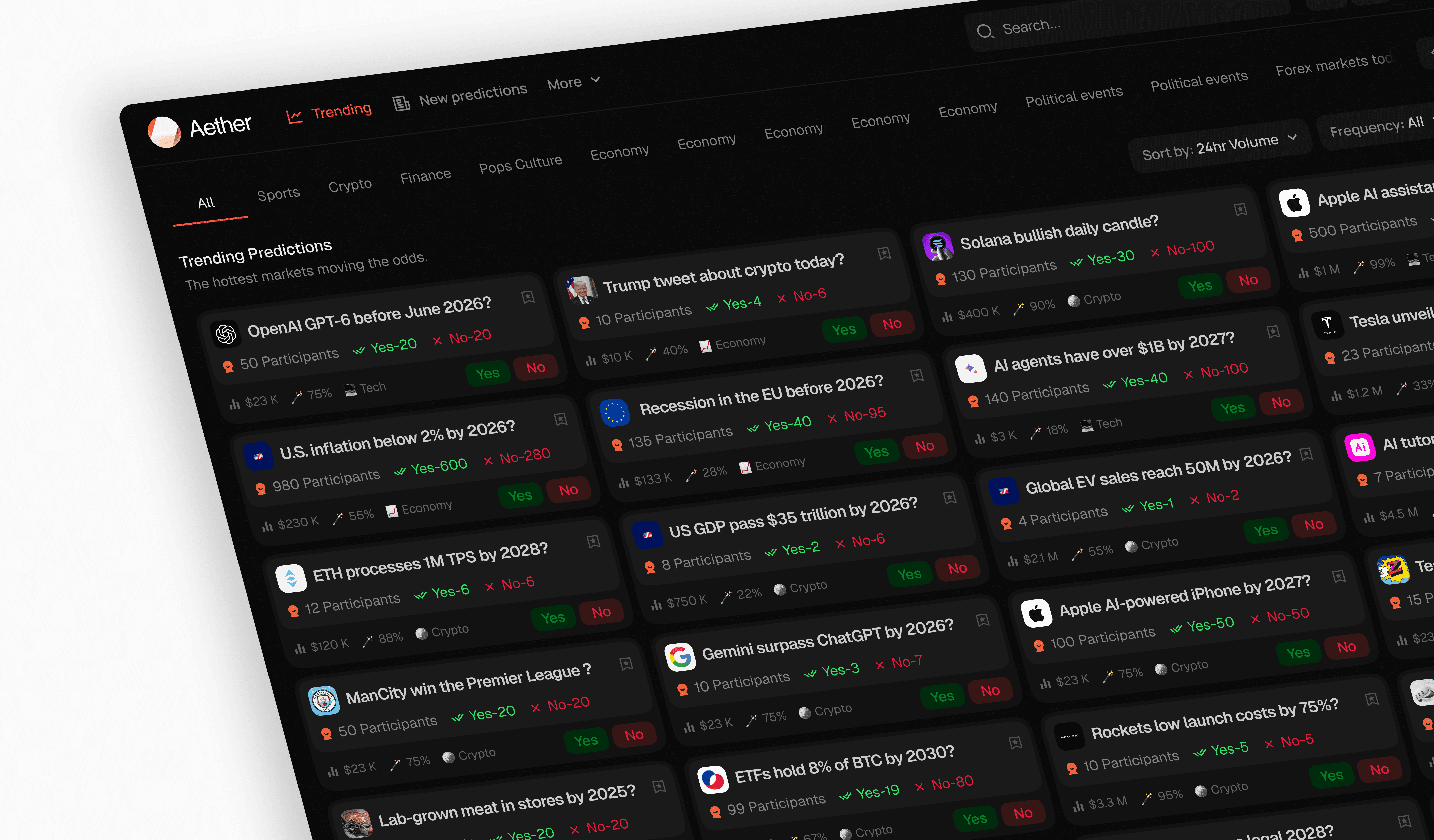 I designed a friendly prediction experience for Aether simplifying onboarding, market discovery, and placing predictions to boost user participation.